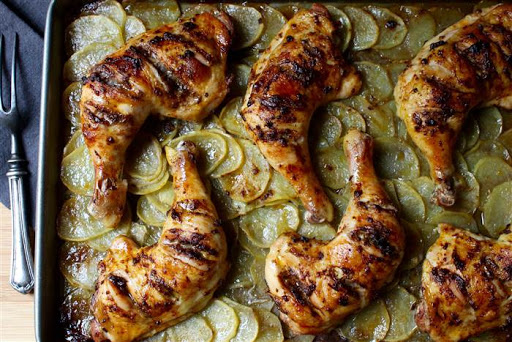Five ingredients (not counting oil, salt and pepper) come together to make this an almost one-pot meal. Serve it with a salad and dinner's complete. Making deep gashes into the chicken before roasting not only allows the spices to penetrate more deeply, it also speeds up the cooking. And using a v–slicer or mandolin on the potatoes, speeds up the prep.