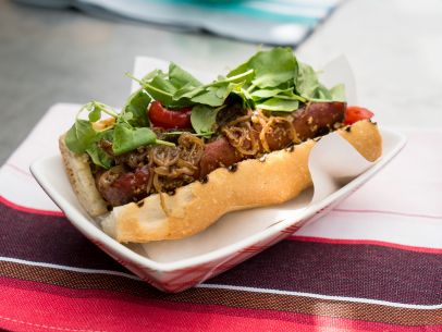 Spread the mustard onto the buns, then add the links. Top with the pickled peppers and caramelized onions.
