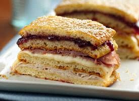 Grease 15x10x1-inch pan. Carefully place 1 crust on pan. Top evenly with turkey. Place second crust over turkey; top with cheese and ham. Place third crust over ham; spread evenly with preserves. Top with fourth crust; brush top with 2 tablespoons honey. Sprinkle honey with sesame seed.