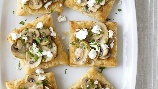 Top the baked puff pastry squares evenly with the mushroom mixture. Crumble goat cheese over mushrooms and sprinkle with parsley.