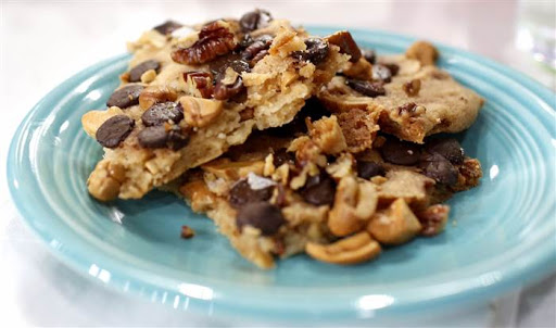 Turn out the dough onto the sheet pan and pat it into a very thin, even layer with your hands (it won't look as if you'll be able to fill the entire pan, but you will--just keep on patting and spreading out the dough all the way to the edges of the pan. Use an offset spatula to give the dough a smooth finish. Sprinkle the chocolate chips and the remaining chopped nuts over the dough and press them lightly into it with your hands.