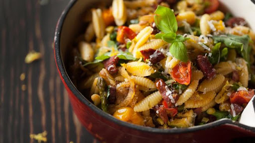 Dans une poêle, à feu moyen, faites chauffer l'huile. Faites revenir le chorizo et l'oignon 2 minutes. Ajoutez le fenouil et laissez cuire jusqu'à ce qu'il devienne translucide. Salez et poivrez. Ajoutez les olives, les tomates et poursuivez la cuisson 1 minute. Ajoutez les asperges et l'eau de cuisson des pâtes. Laissez réduire quelques minutes, puis ajoutez les pâtes, la roquette et les graines de tournesol. Mélangez bien.