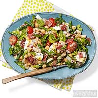 In a large, deep skillet, bring a few inches of water to a boil. Prepare a large bowl of ice water to cool the green beans. Salt the boiling water; add the green beans. Cook until crisp-tender, about 3 minutes; drain. Transfer to the ice water to cool; drain. Cut the beans on an angle into thirds; place in a large bowl. Add the chickpeas, cannellini beans, tomatoes, herbs, onion, celery, bocconcini and prosciutto.