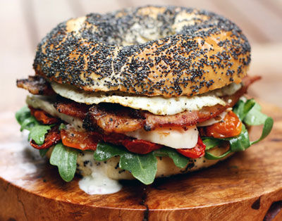 Make the sandwich: drizzle 1 tbsp. buttermilk dressing onto the lower half of each bagel. Top with greens, chicken, bacon, fried egg, roasted tomato halves, an additional 1 tbsp. buttermilk dressing, and the top half of the bagel. Slice each sandwich in half and serve immediately.