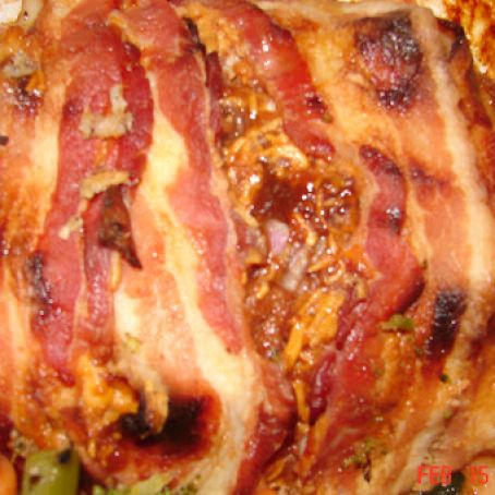 Classic meatloaf takes a nod from the bacon cheddar cheese burger with this meatloaf that is topped with barbecue sauce, cheese and a bundle of bacon. Serve with a side of mashed potatoes, or baked potatoes.