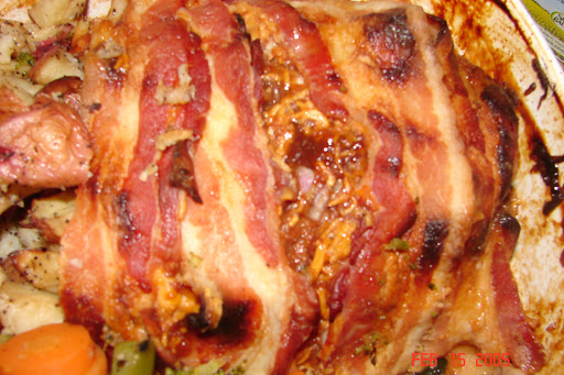 Place the meatloaf mixture into a large baking dish and form into a loaf. Pour the remaining barbecue sauce on top, sides and end of meatloaf. Sprinkle the cheese on top of the barbecue sauce. Place the bacon strips across the width of the meatloaf, covering it completely. It is okay if some of the bacon overlaps.