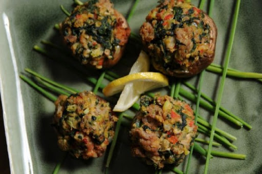Add onions, chopped mushroom stems, celery, garlic and pimentos and cook for another 4 minutes. Add spinach and cook for another 2 minutes.