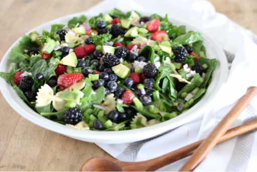 Alternately, toss the greens, pasta and all of the other ingredients in a large bowl with about ½ of the dressing, reserving some of the fresh berries and the avocado. After tossing, place in serving bowl, top with additional fruit and avocado and drizzle with a little of the remaining dressing.