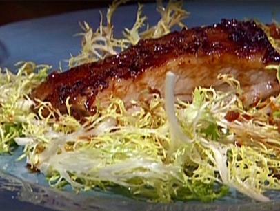 To serve, place a portion of the pork on a warmed entree plate with 2 ounces of the frisee. Pour some of the sauce over the pork and serve immediately.