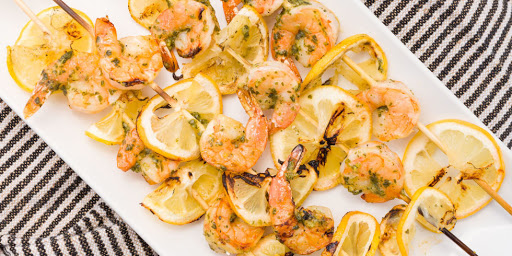 1 Preheat grill to medium-high. Skewer shrimp and lemon slice. Drizzle with olive oil and season with salt and pepper. Grill, turning occasionally, until shrimp is opaque and lemons slightly charred, 4 to 5 minutes.