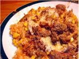 Combine ground beef evenly over the bottom of crockpot. Sprinkle with bacon and onion powder. In a medium bowl combine tomato paste, salt, pepper, water and chili powder. Pour half ovefr bacon and onion powder. Sprinkle rice over top and then corn. Add remaining tomato sauce mixture. Cover and cook on low about 5 hours. During the last 5 minutes of cooking sprinkle cheddar cheese over top of casserole and cover.