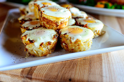 Spray two muffin pans generously with cooking spray. Scoop 3 to 4 tablespoons of grated potato into each muffin cup. Use your fingers to gently press the sides and bottom in each muffin hole to make a nest (don't press the potatoes firmly against the pan; they should sit lightly in the pan.) Spray again (very lightly!) with cooking spray. Bake for 15 to 20 minutes. Watch and make sure they do not burn. (If they seem like they're not browning, kick up the temp to 450.) Remove when the nests are golden brown.