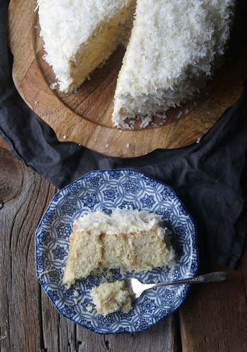 Frost each layer of the cake and stack. Frost the top and outside of the cake and gently press the coconut shreds around the entire cake.