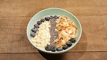 Remove to a cereal bowl. Top with toasted coconut, sliced almonds, chia seeds, drizzle with honey and blueberries around the bowl.