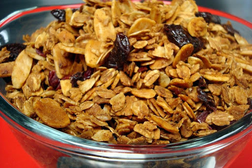 Place in 300 degree oven and bake for 10 minutes, then stir. Bake another 10 minutes and stir again. Repeat again until mixture has baked for 30 minutes, and the oats and almonds are golden brown.