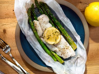 Lay out 1 large sheet (about 16 inches by 12 inches) of parchment paper. Place 4 asparagus spears in the center of the paper, then 1 fish fillet on top and then a slice of lemon. Season with salt and pepper, 1 tablespoon of lemon juice, 1 tablespoon of extra-virgin olive oil and 1 sprig of thyme. Fold over the ends of the parchment paper to enclose the fish. Place on a baking sheet. Repeat with the remaining ingredients.