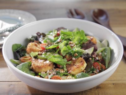 Coat each goat cheese round with flour, then egg and then panko, shaking off excess, and fry until golden on both sides, about 1 minute per side.