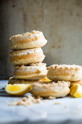 Dip the donuts into the frosting letting the excess drip back into the bowl and then press them into the crumble mixture.