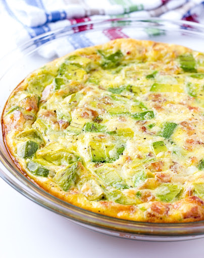 Pour the egg mixture into the pie plate. If necessary, use a spoon to push some of the avocado and bacon around to ensure that it is evenly distributed throughout the quiche.