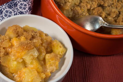 In a medium bowl, mix the sugar and flour. Then, add pineapple and cheese and stir until there are no more dry particles. Spoon this mixture into the prepared baking dish.