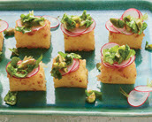 Cut the polenta into 16 pieces. Top with the radishes and arugula tapenade.