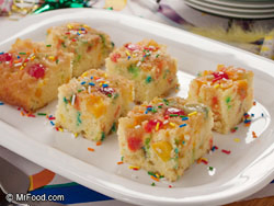 3.In a large bowl, beat cake mix, water, oil and eggs according to package directions. Stir in sprinkles and pour into prepared baking dish.
