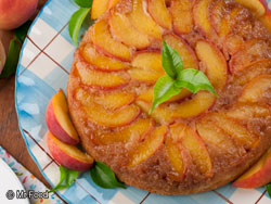 In a large bowl, combine flour, baking powder, baking soda, and granulated sugar. Beat in softened butter and eggs until smooth. Stir in sour cream and vanilla until well blended. Pour batter over peaches.