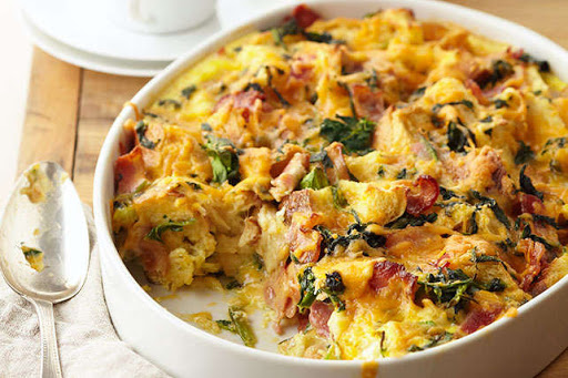 Whisk eggs and milk in large bowl until well blended. Stir in bread. Add spinach, bacon and 1-1/2 cups cheese; mix lightly.