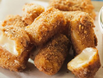 Line a cookie sheet with parchment. Dip the mozzarella cheese chunks into the egg wash, coating completely, and then into the pretzel crumbs, coating the cheese completely on all sides. Transfer to the prepared cookie sheet. Let the cheese stand for 5 minutes to set the coating, and then repeat the process, adding more eggs to the egg wash if necessary. When all the cheese is coated again, return to the cookie sheet and transfer to the freezer. Freeze the cheese for at least 2 hours and up to overnight. The longer the cubes freeze, the better they will fry.