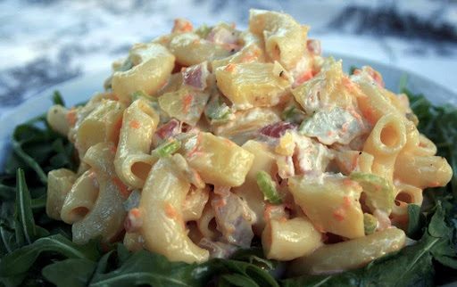 Put all veggies and elbow macaroni in a bowl, and dump in 1 cup of mayonnaise. Yep, full-fat mayo. Add 4 heaping tablespoons of sweet pickle relish, some big squinches of salt and pepper, 1 teaspoon paprika. Mix together, without pulverizing the macaroni or potatoes. Pop in to fridge to chill for at least an hour.