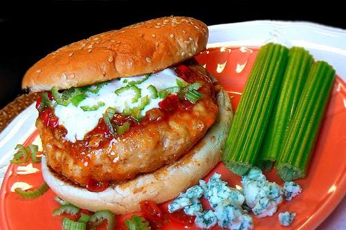 4)Place each patty on a toasted hamburger bun with any fixings you like. Instead of ketchup,try some chunky blue cheese dressing. Serve with cut-up carrots and celery,and more dressing for dipping.