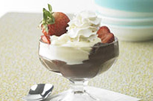 SPOON chocolate pudding evenly into two dessert glasses. Cover with layers of strawberry slices and vanilla pudding.