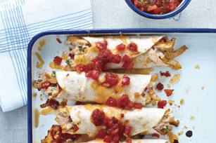 SPOON about 1/3 cup chicken mixture down centre of each tortilla; roll up. Place, seam-sides down, in 13x9-inch baking dish sprayed with cooking spray; top with remaining salsa and shredded cheese.