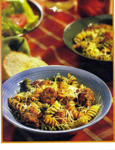 3)Stir pesto sauce,water and pasta into sausage. Cover and cook over medium heat 5-8 minutes,stirring occasionally,until sausage is no longer pink in center.