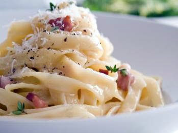 3. Beat the eggs, Parmesan, and Romano together and season with pepper. Drain the pasta well and return to its saucepan. Add the egg mixture and the contents of the pan with the pancetta, including the fat, and mix quickly until the pasta is well coated. Serve immediately, with extra Romano passed on the side.