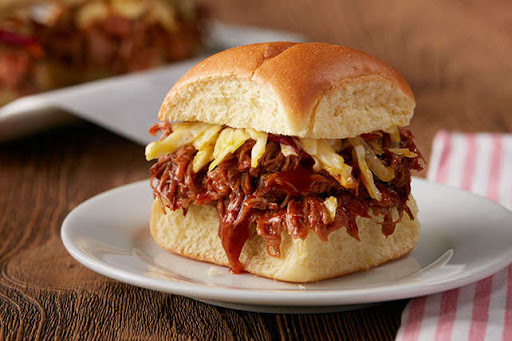 Transfer meat to cutting board. Discard all but 1/4 cup sauce from slow cooker. Pull meat into shreds with 2 forks. Add to reserved sauce in slow cooker; stir in remaining barbecue sauce.