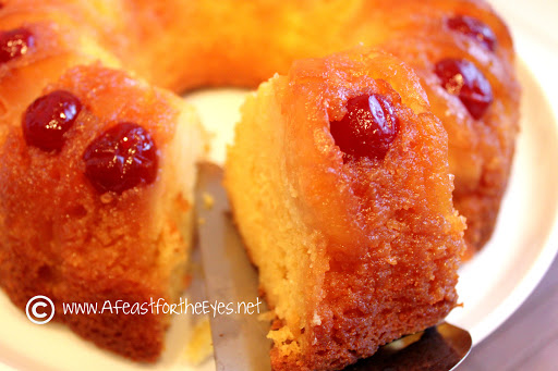 Cool the cake for about 10 minutes before running a knife around the edges and inner ring of the pan. Invert onto a serving plate and slice between pineapple rings to serve.