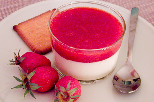 Serve the panna cotta in their ramequins topped with a layer of coulis, or unmold carefully onto plates and drizzle with the coulis. Decorate each plate with three whole strawberries and a butter cookie.