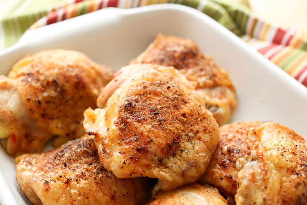 Bake for one hour, until most of the fat has rendered out of the chicken and the skin is golden brown and crisp. Remove from the oven and let rest about 5 minutes before serving.