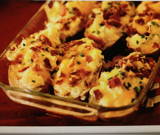 Fill potato shells; sprinkle cheddar cheese green onions and bacon if desired.