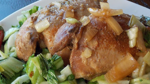 Combine onions, garlic, apple cider vinegar, soy sauce, brown sugar, and bay leaf in slow cooker. Season with black pepper. Place chicken thighs atop mixture. Sprinkle paprika over chicken thighs.