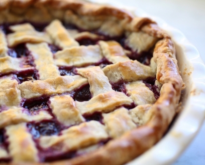 Place 5 parallel strips of dough on the top of the pie at an equal distance apart. Place a piece of plastic wrap perpendicular over half of the pie. Fold back the first, third and fifth strip of dough on to the plastic wrap so it does not touch the cherry filling. Place one strip perpendicular over the parallel strips, then unfold the strips on the plastic back over the perpendicular strip. Continue with this process but now with the second and forth strip on the plastic wrap, then place another perpendicular strip over the parallel strips. Continue to finish one side of the pie, moving the plastic wrap as needed. Finish up the second half of the pie.