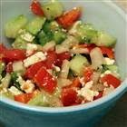 In salad bowl, combine tomatoes, bell peppers cucumber, onion and olives.