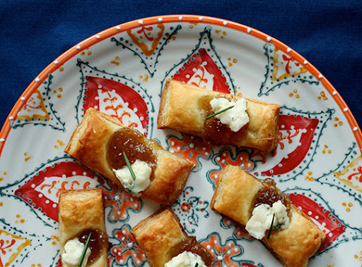 2. Spread ½ teaspoon of the fig jam in the center of each rectangle. Place the baking sheet in the oven and bake until the puff is golden, 8 to 10 minutes. Remove the baking sheet from the oven and top each pastry with a few small knobs of blue cheese. Top with 1 to 2 chive pieces and serve warm.