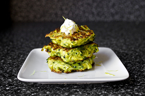 For the topping, if using, stir together the sour cream, lemon juice, zest, salt and garlic and adjust the flavors to your taste. Dollop on each fritter before serving. These fritters are also delicious with a poached or fried egg on top, trust me.
