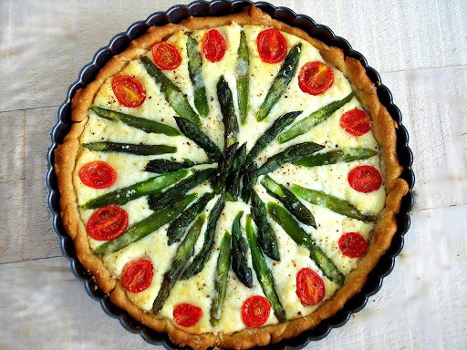 Arrange your asparagus on top and sink them into the ricotta. I blanched the asparagus for 3 minutes in boiling water which was then plunged into ice water, thoroughly drained and patted dry. Rinse and pat dry about 8-10 cherry tomates and cut in half, placing stragetically between the asparagus spears. Sprinkle with more cheese and a drizzle of olive oil on top.