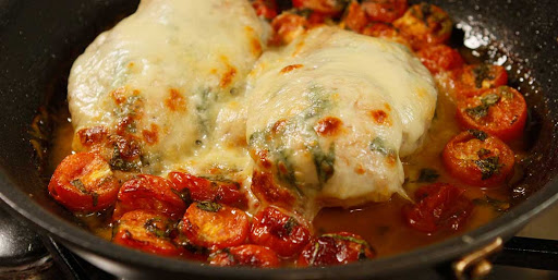 Cut four slices of mozzarella cheese and place two slices over each breast, or enough to cover whole breasts.