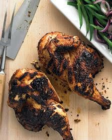 Heat grill to medium-low; lightly oil grates. Wipe chicken with paper towels to remove excess paste, and season with 1 tablespoon coarse salt. Place, skin side down, on grill and cook, turning occasionally, until lightly charred and an instant-read thermometer inserted in thickest part of a thigh (avoiding bone) registers 165 degrees, 35 to 40 minutes (if browning too quickly, move to a cooler part of grill). Let rest 5 minutes before serving.