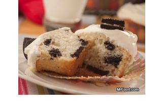 Make cake mix according to package directions. Stir in chopped sandwich cookies. Spoon batter into muffin tins, filling each cup about 3/4 full.