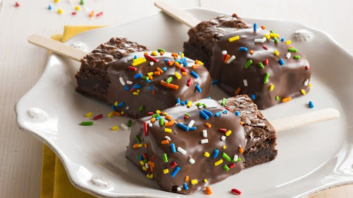 Place brownies in freezer for 30 minutes. Remove brownies from pan by lifting foil; peel foil from sides of brownies. Cut brownies into 15 rectangular bars, 5 rows by 3 rows. Gently insert craft stick into end of each bar, peeling foil from bars. Place on cookie sheet; freeze 30 minutes.